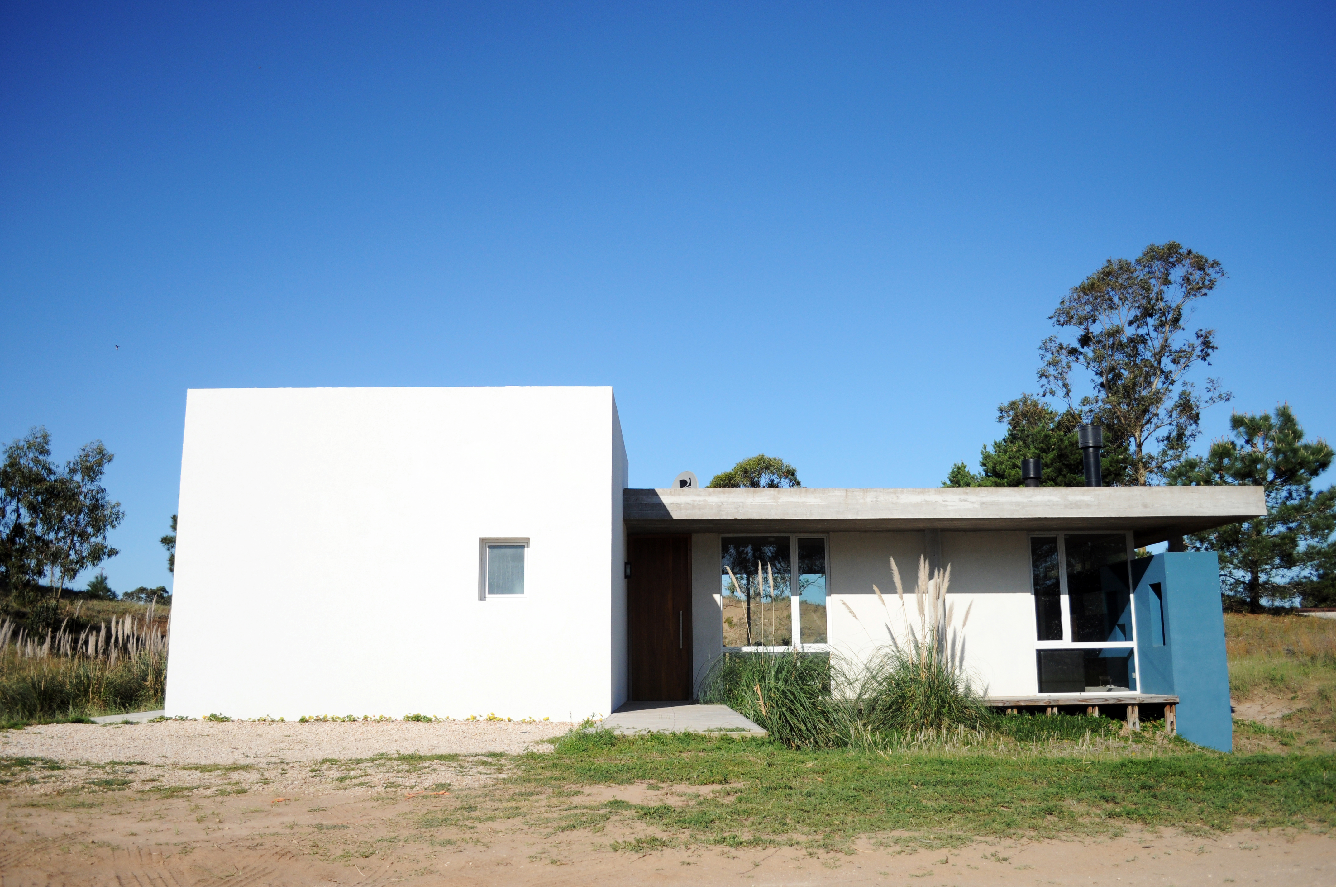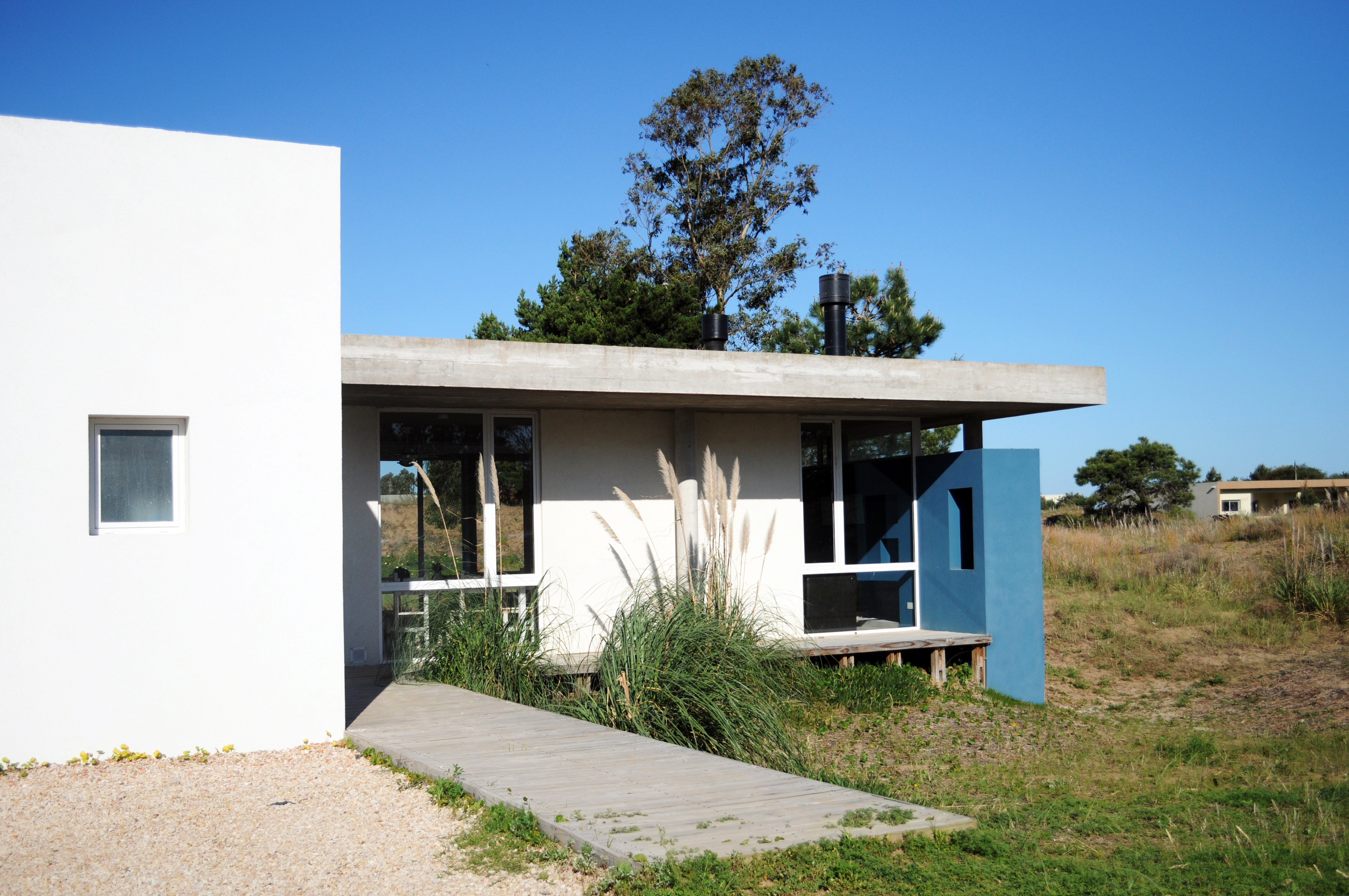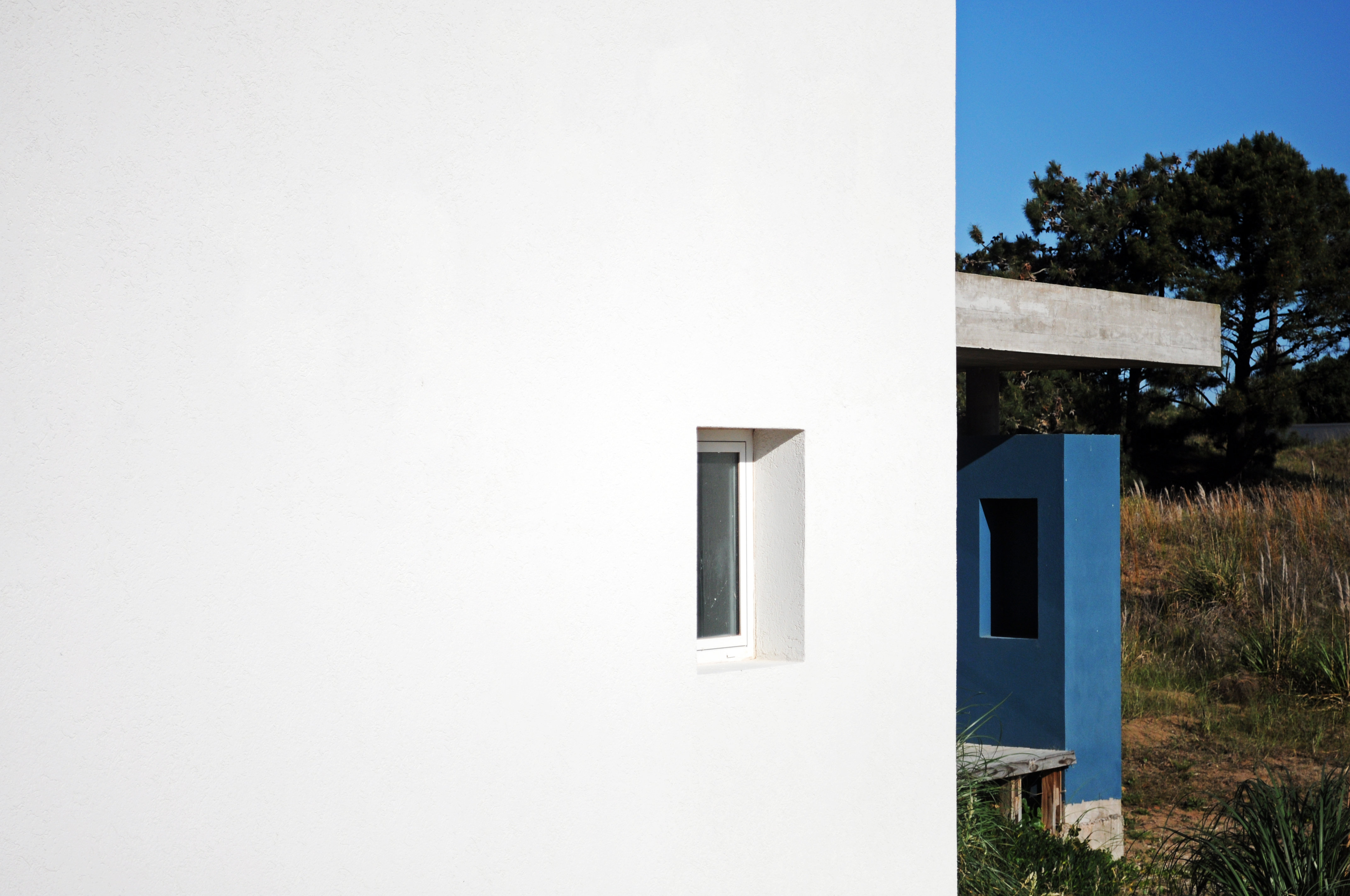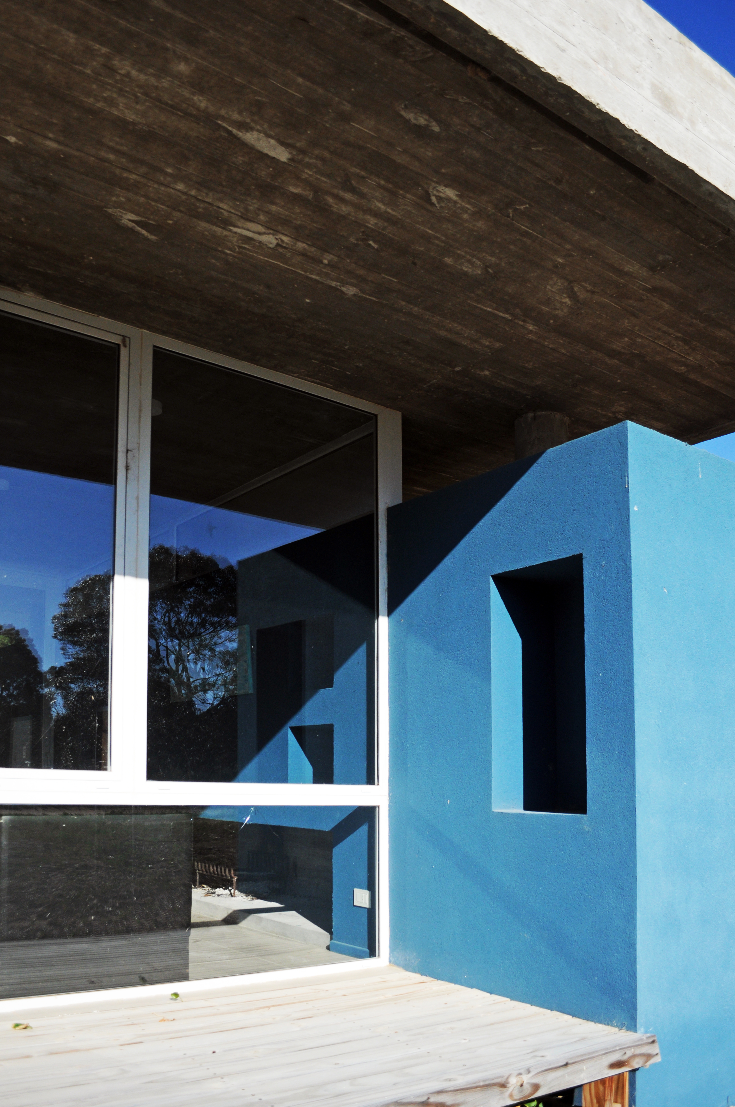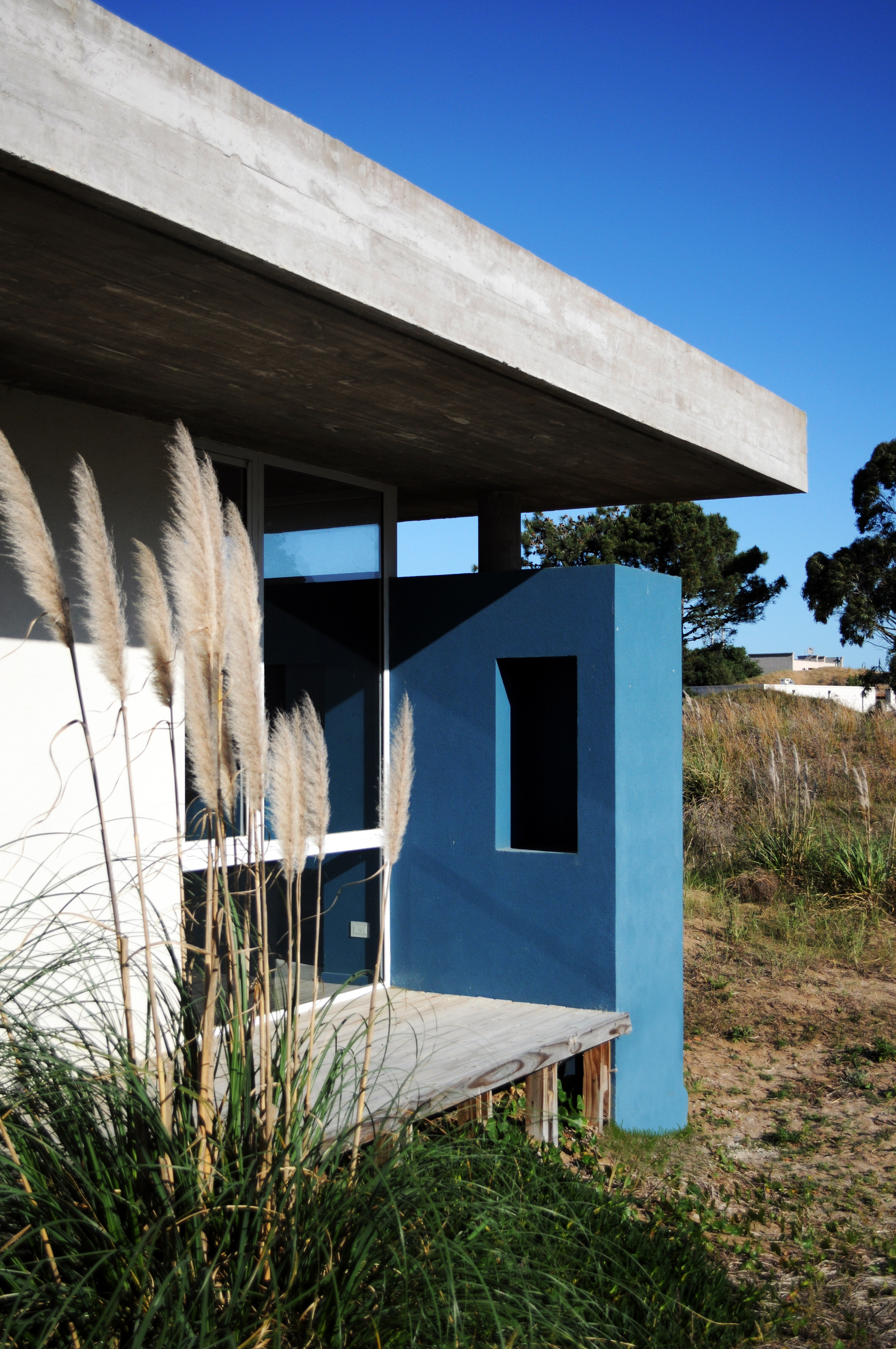 La combinación de volúmenes opacos de mampostería blanca en el sector de descanso, se contrapone con la liviandad propuesta en el Estar. Reafirma esta idea la losa que se despega de las paredes azules mediante el diseño de carpinterías que se conectan por sus vértices y dan como resultado un proyecto de morfología simple, creando una relación "interior- exterior" de gran transparencia acorde con la topografía del terreno.