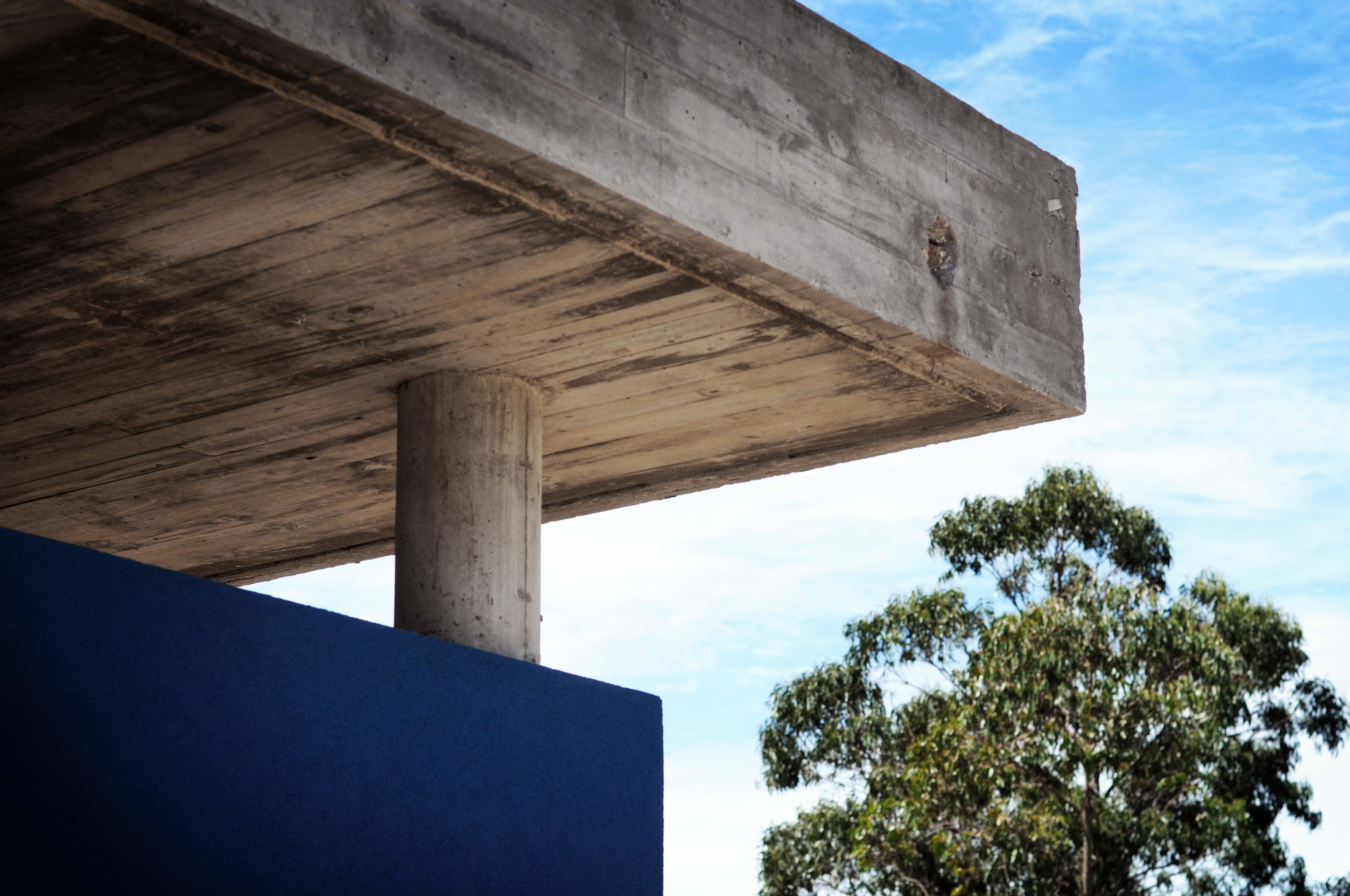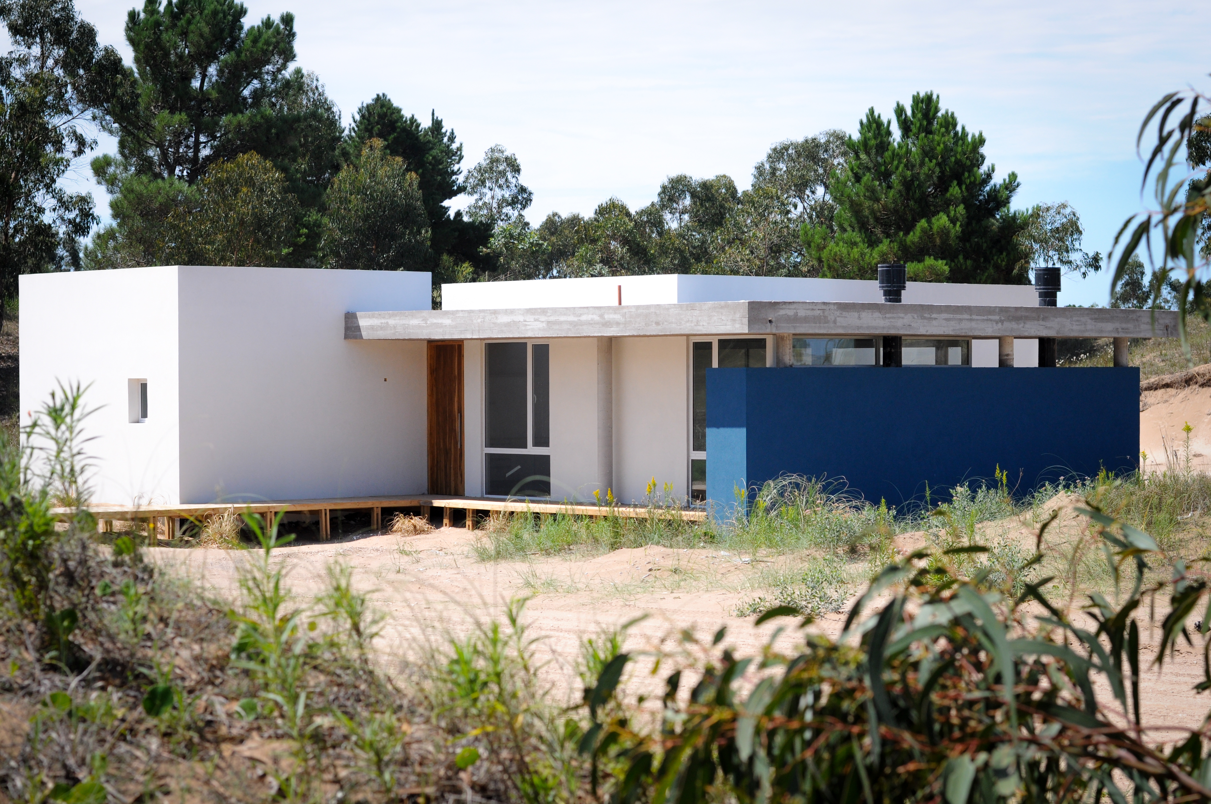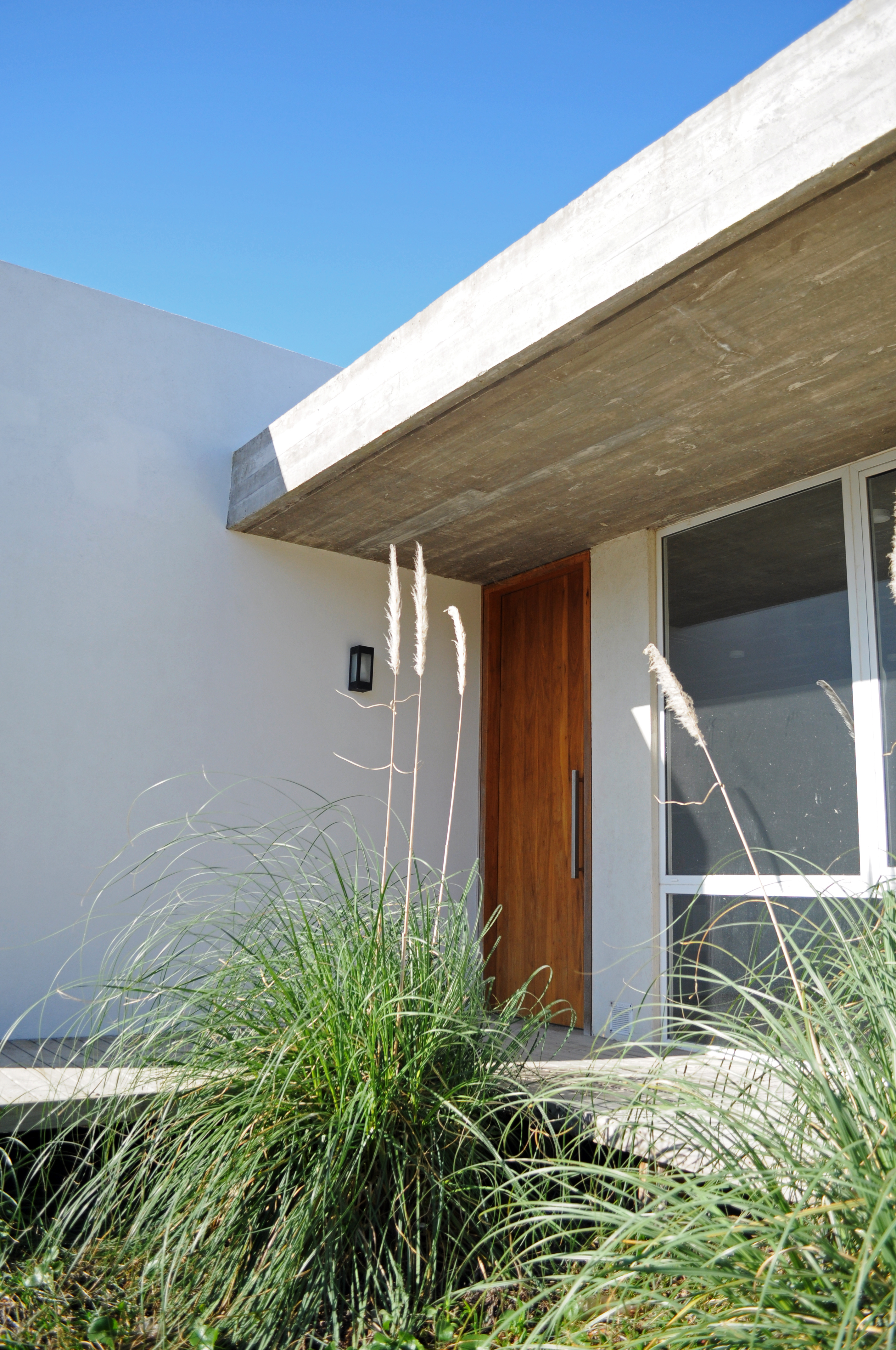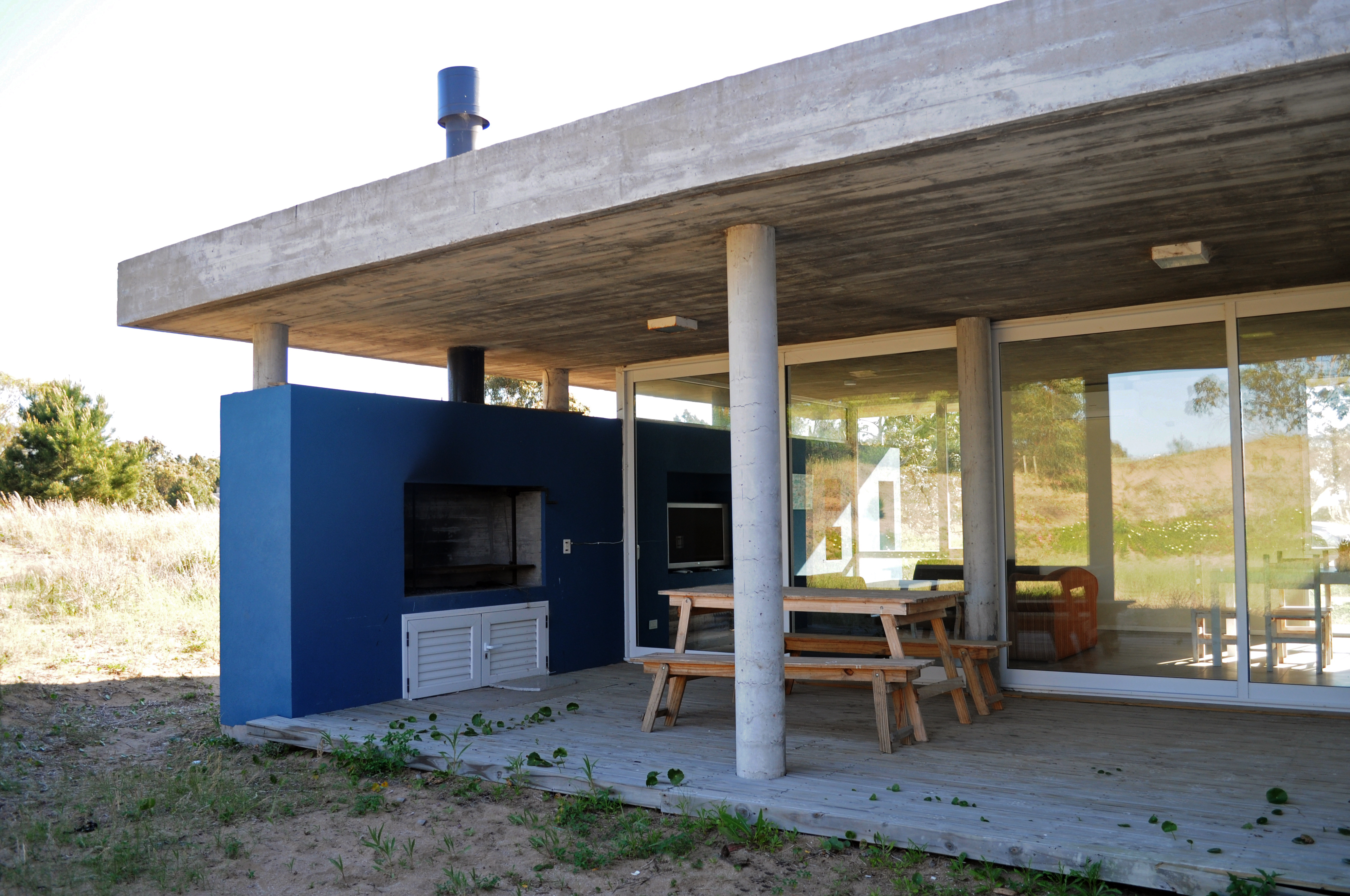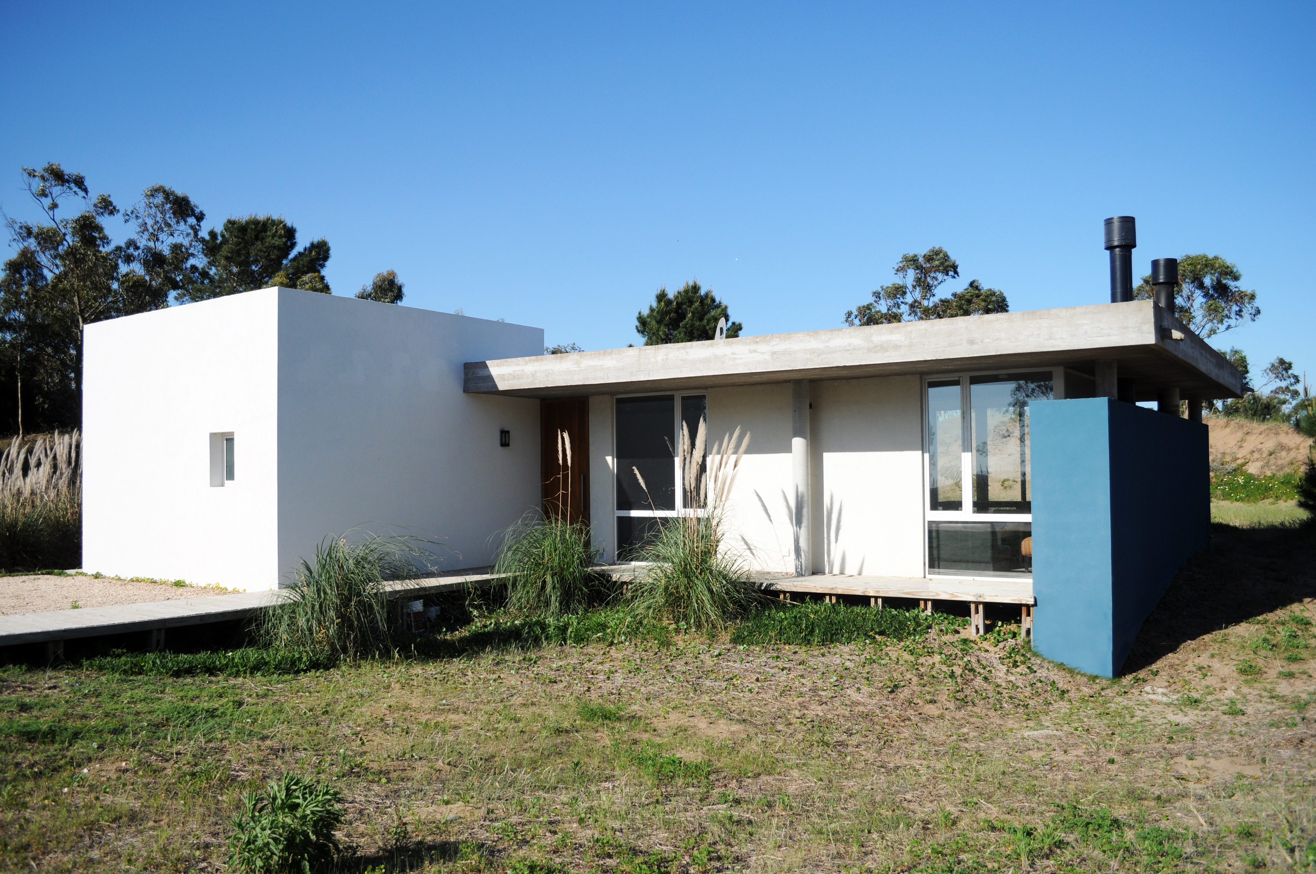 La combinación de volúmenes opacos de mampostería blanca en el sector de descanso, se contrapone con la liviandad propuesta en el Estar. Reafirma esta idea la losa que se despega de las paredes azules mediante el diseño de carpinterías que se conectan por sus vértices y dan como resultado un proyecto de morfología simple, creando una relación "interior- exterior" de gran transparencia acorde con la topografía del terreno.