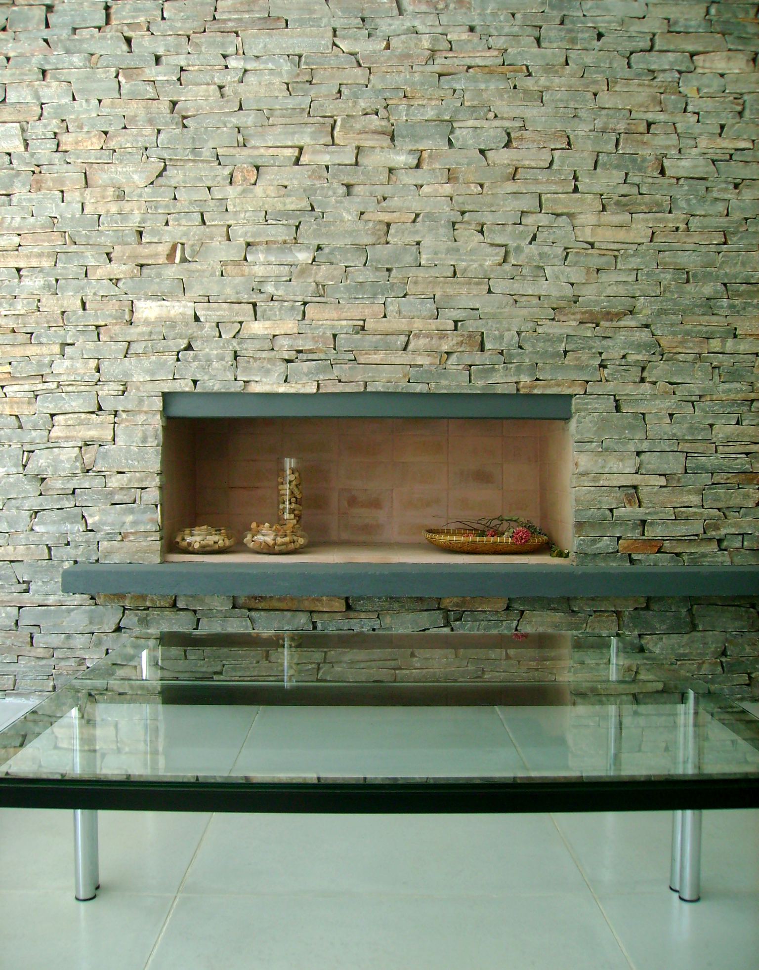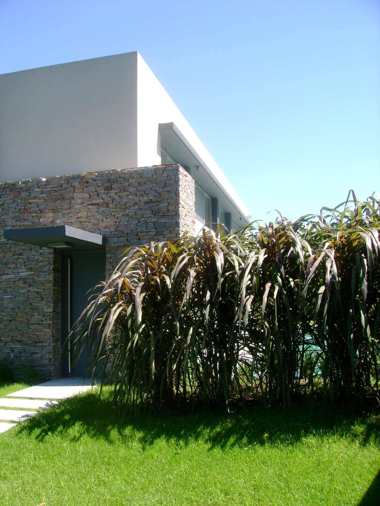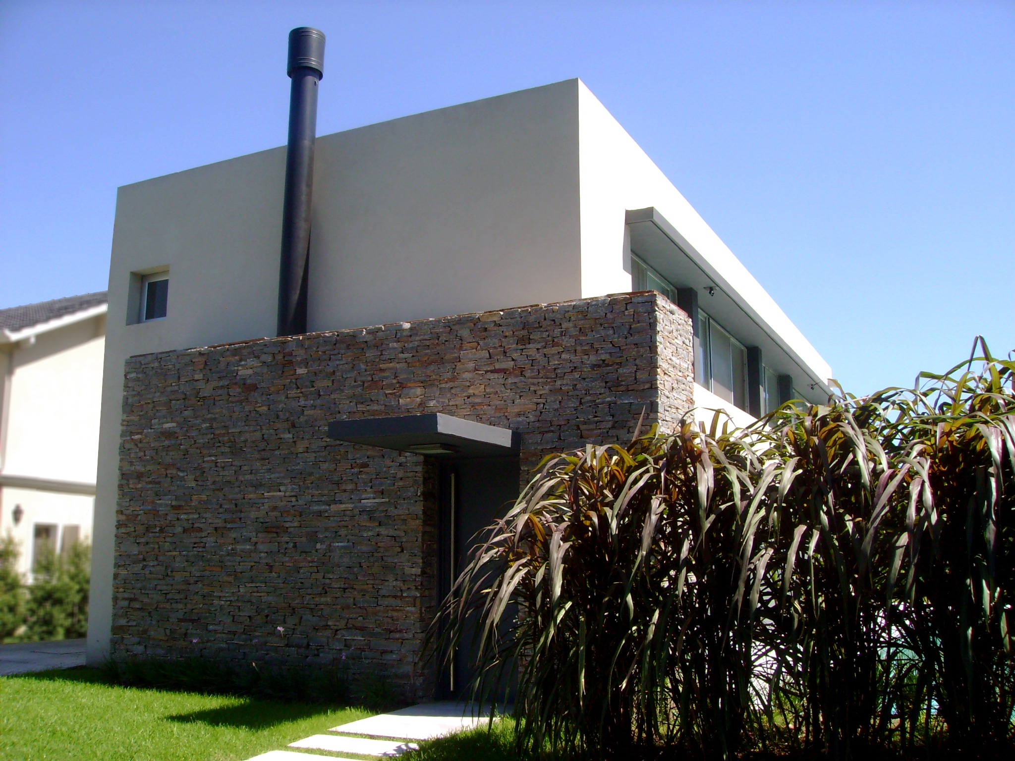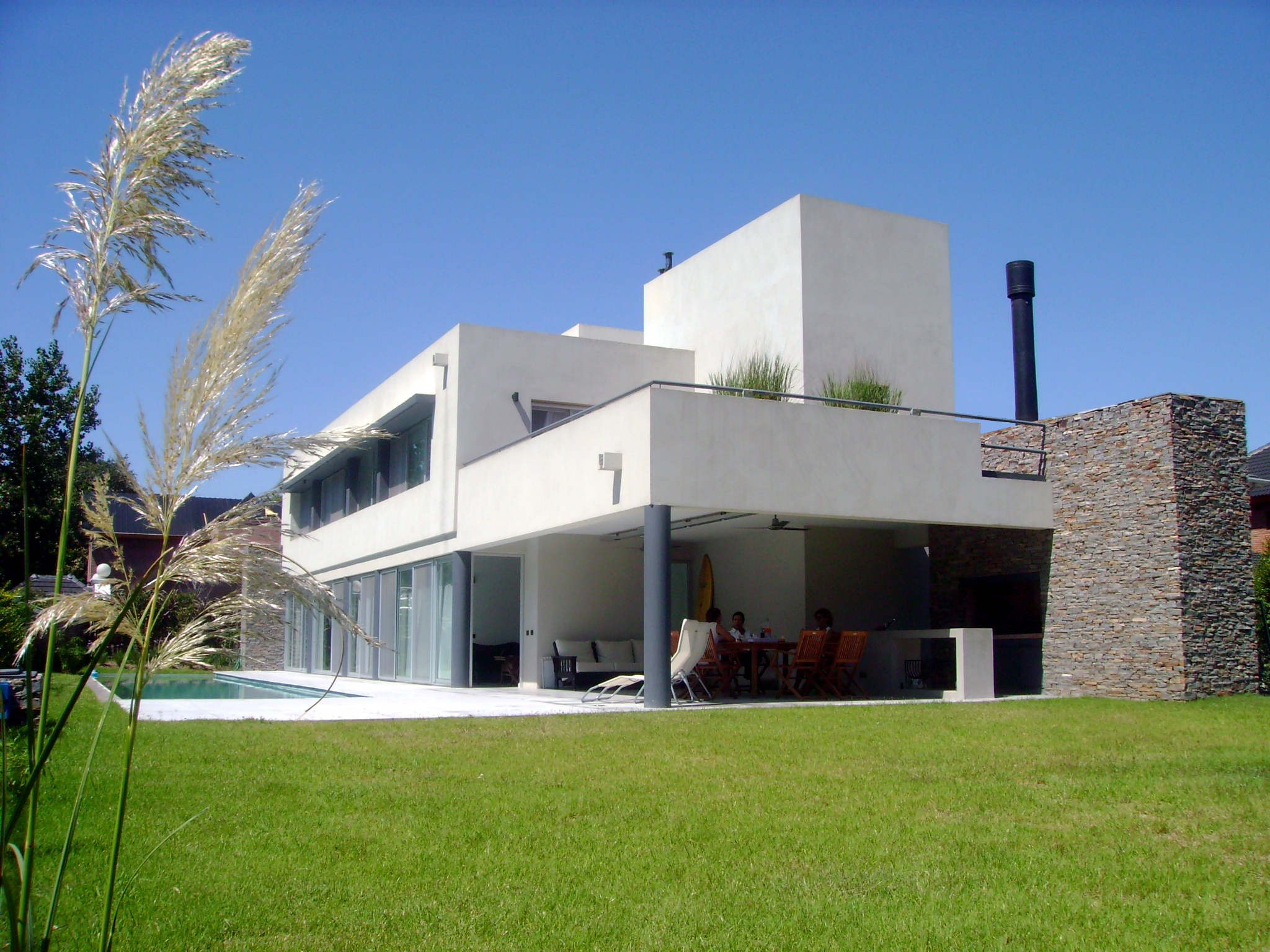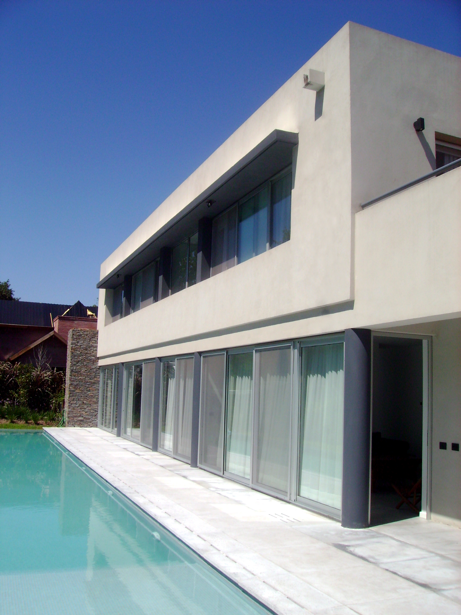 El revoque liso, el aventanamiento corrido sobre el este y el ritmo de las columnas, se enmarcan con el detalle de la piedra en la fachada y en la parrilla, creando un criterio formal de opacidad hacia el sur y oeste y una clara apertura sobre el este y el norte.