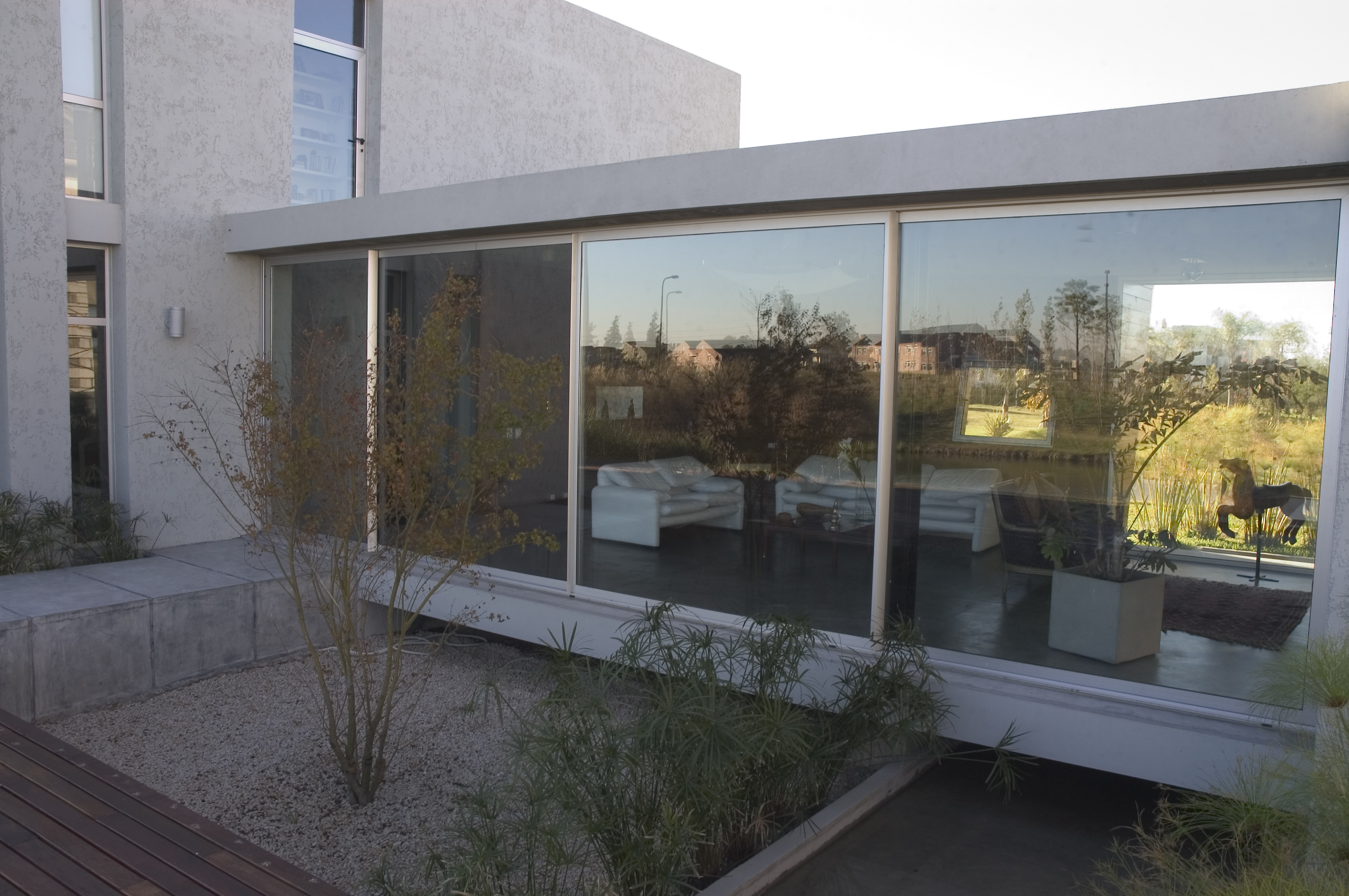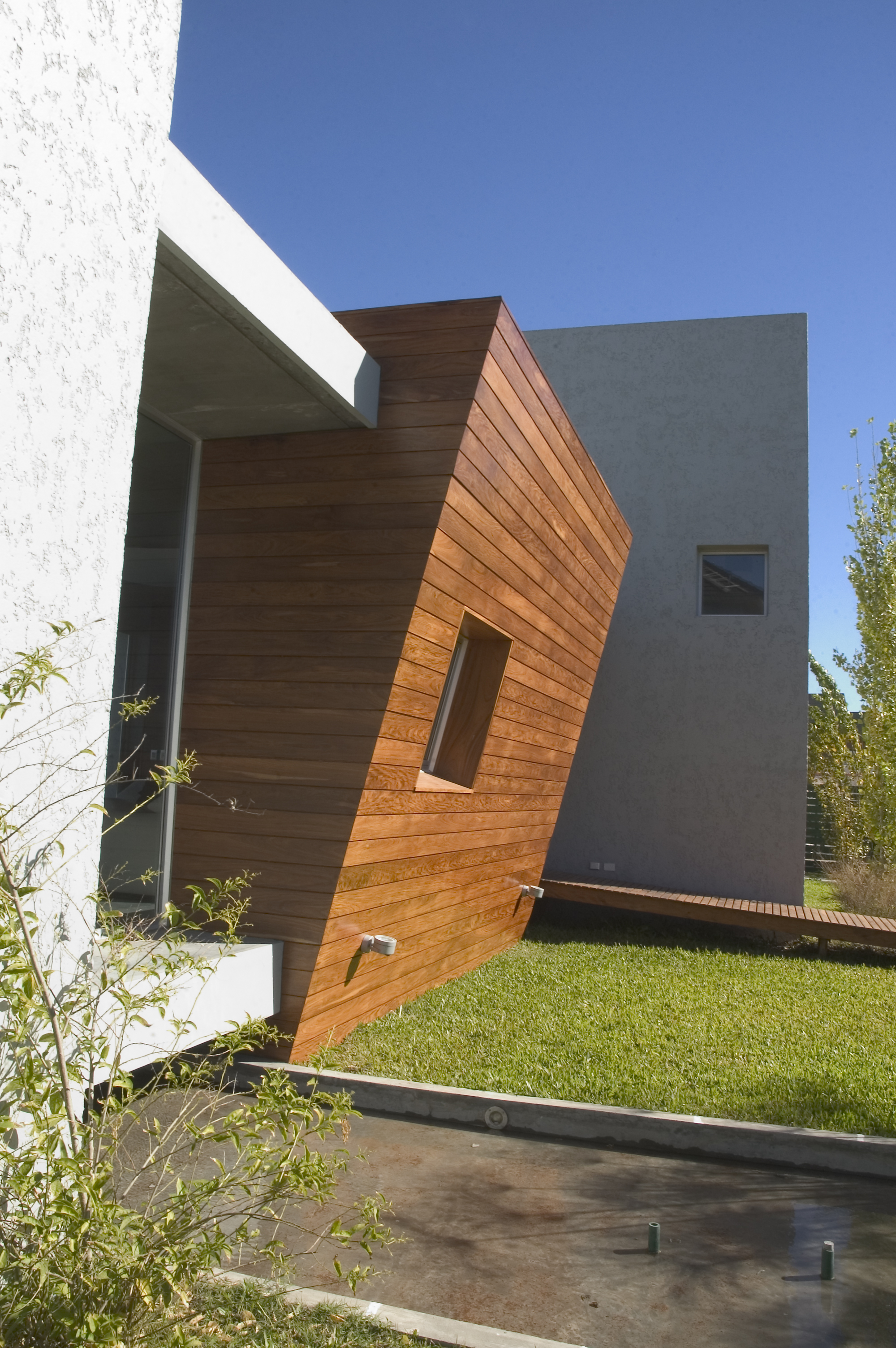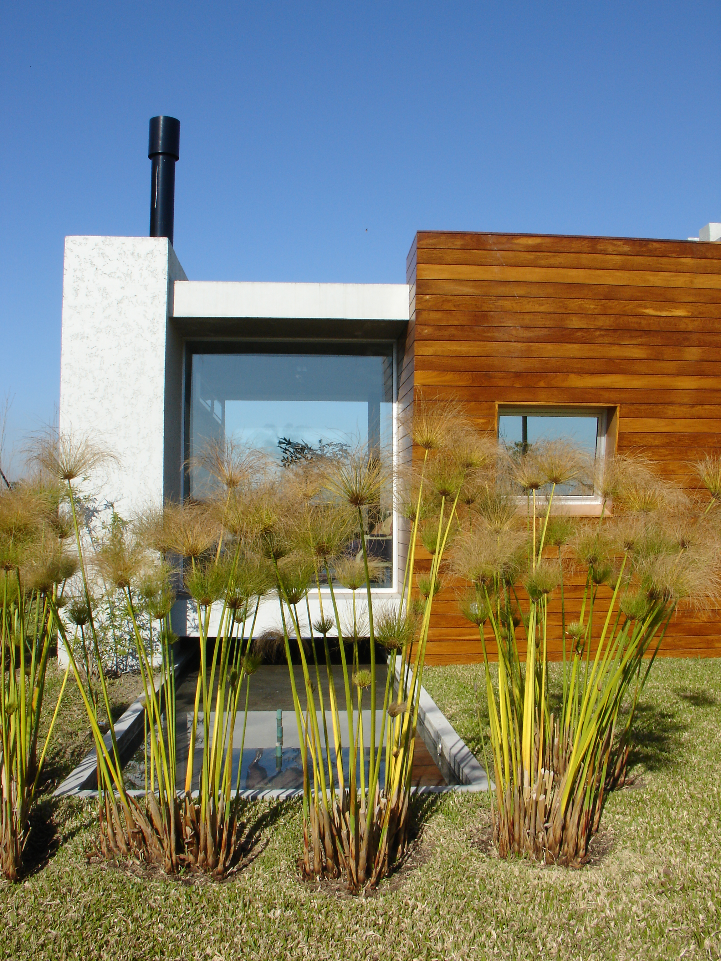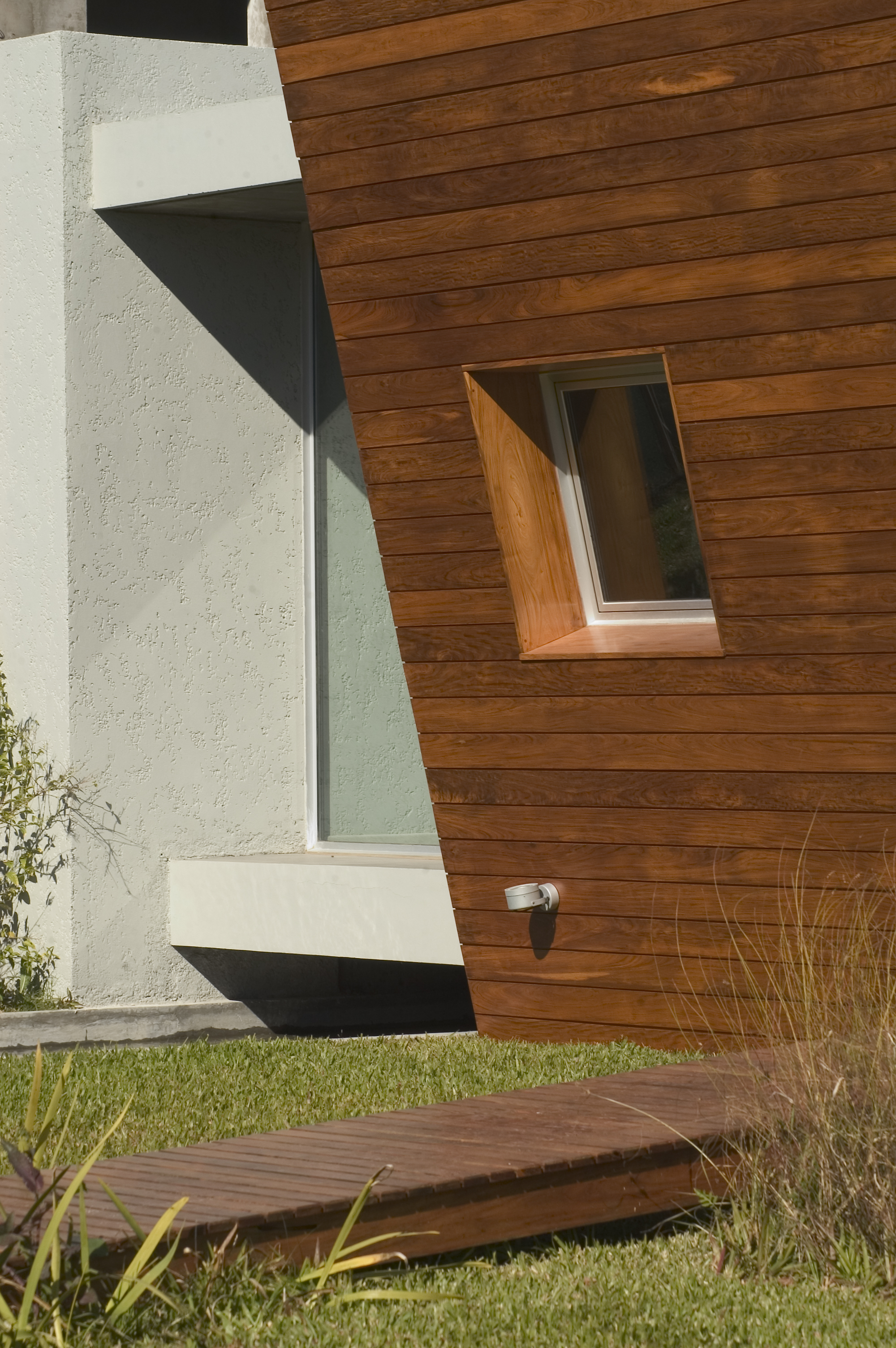 En el interior, el contrapunto del muro inclinado de madera y la carpintería piso a techo que la enfrenta, ofrecen una singular calidad espacial en el sector de estar, generando un tamiz visual, ajustado sobre el frente y una gran exposición exterior hacia el jardín.