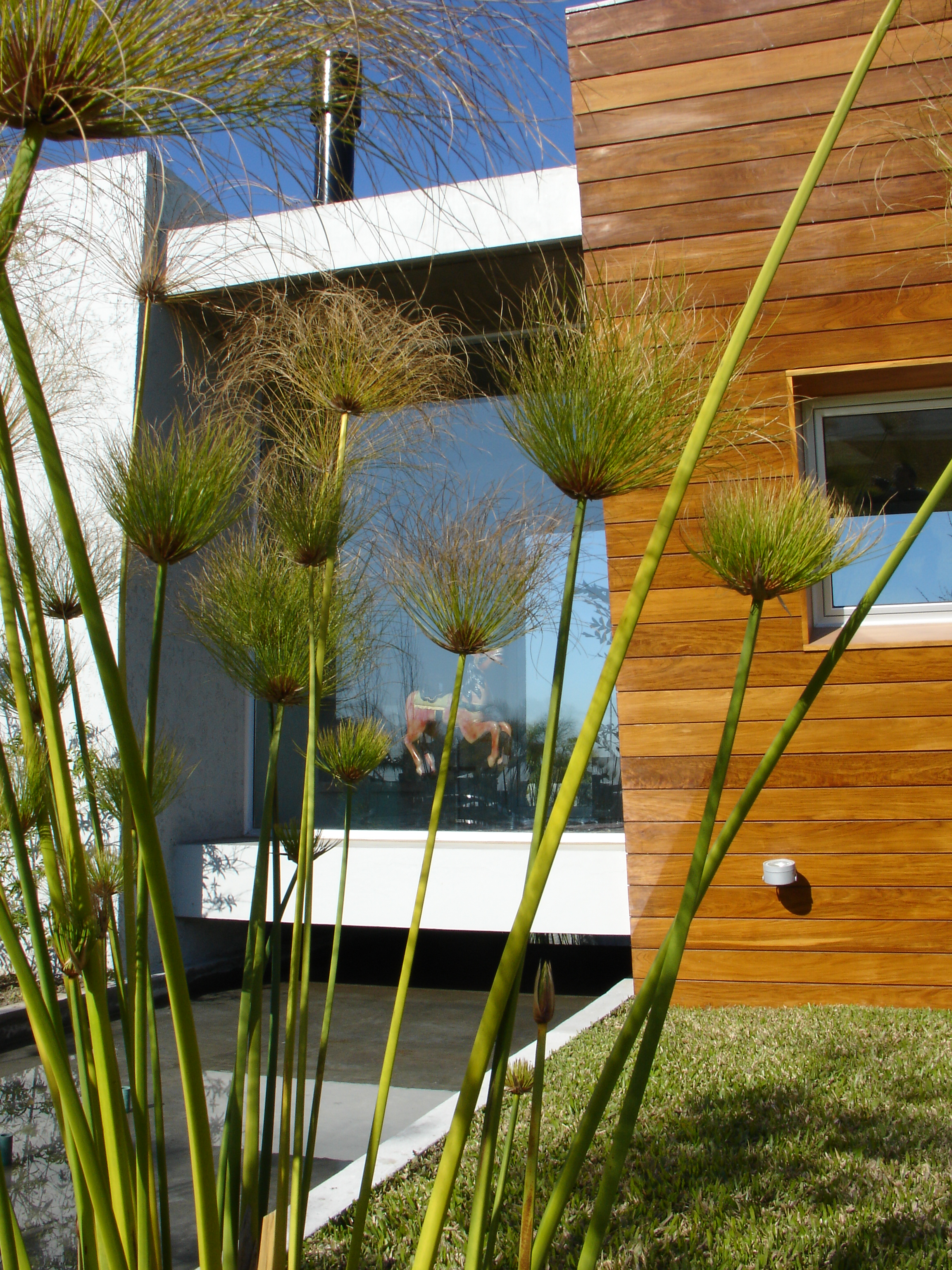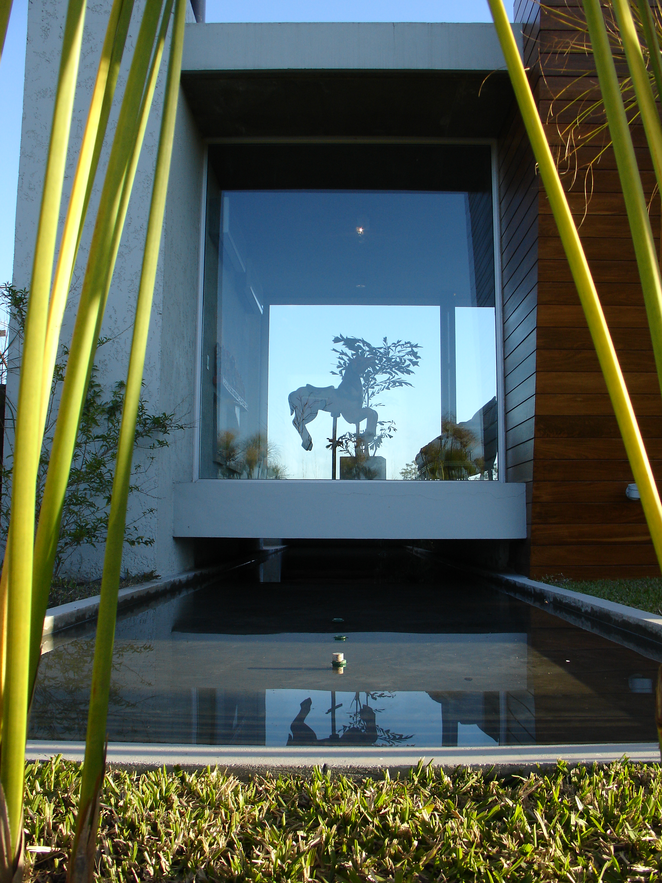 Son para destacar el ingreso a la vivienda por una rampa que busca la calle y desde la cual puede intuirse lo infinito del horizonte, como también los efectos propuestos en el remate del espejo de agua.