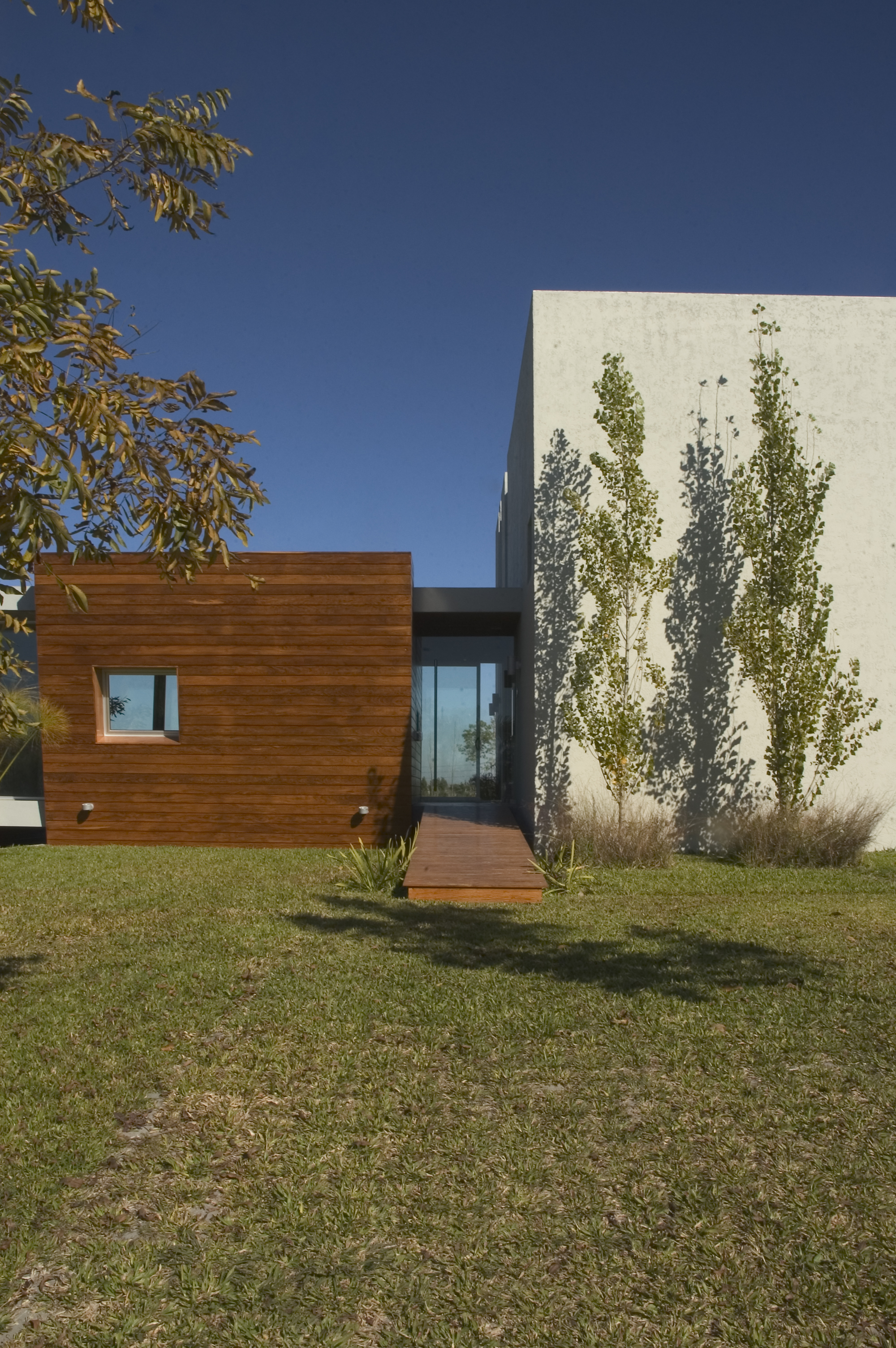 La composición sobre el frente se completa con un plano inclinado en tablas de lapacho y una torre de cierre lateral, donde se ubica el dormitorio con vista al gran lago.