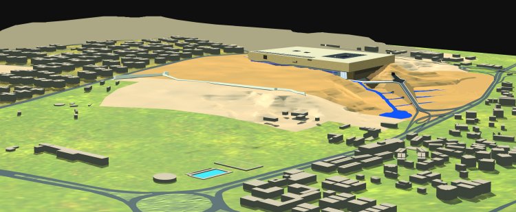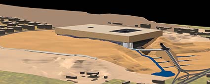 La propuesta expresa claramente la decisión de disminuir a su máxima expresión el carácter del edificio, convirtiéndolo en una caja semienterrada en la topografía existente, sin competir entonces, con el complejo formado por las pirámides y la esfinge.