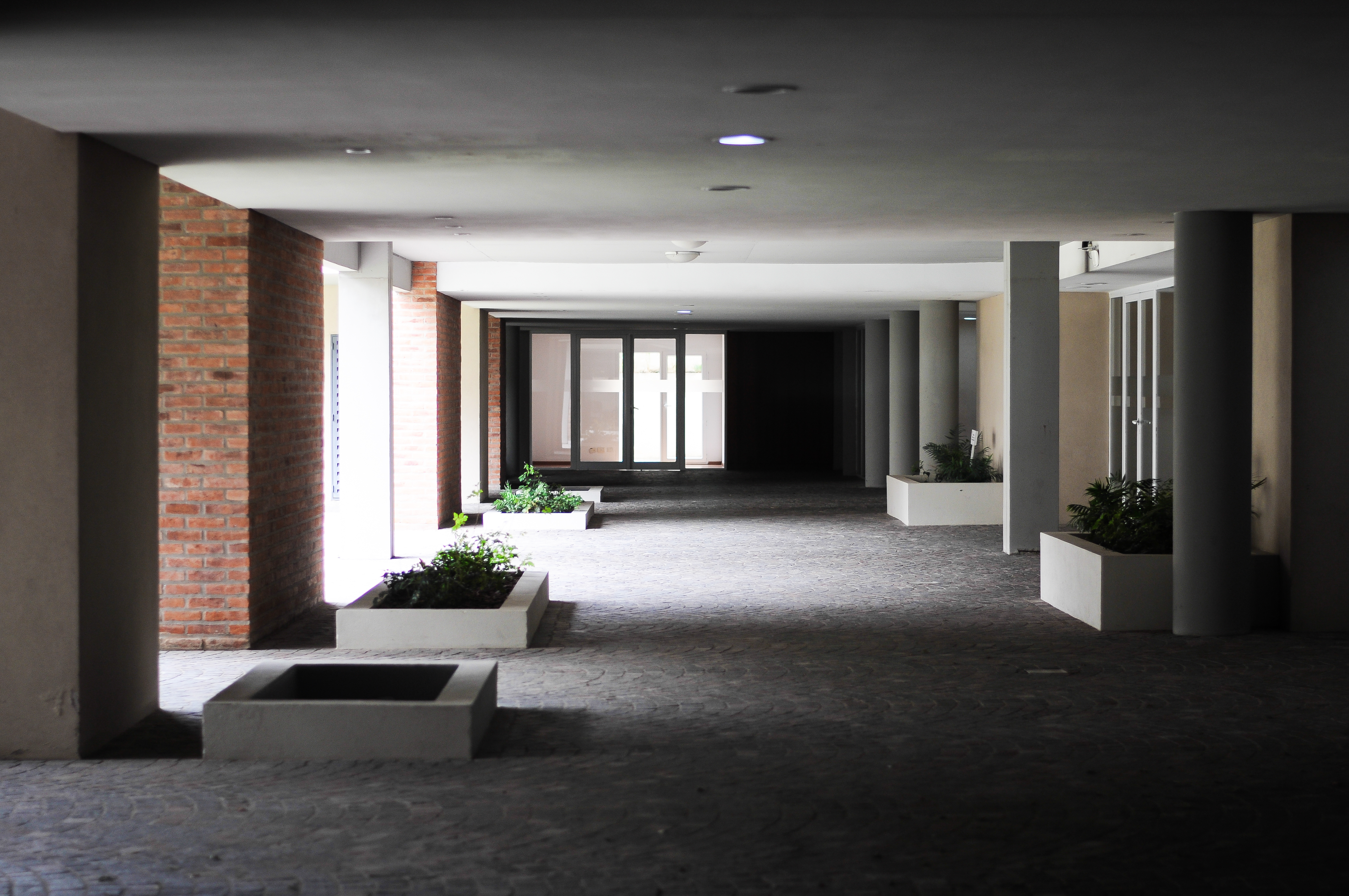 En planta baja una galería que rodea el espacio central, vincula los seis núcleos de ascensores y escaleras con el resto del equipamiento comunitario. Es ahí donde se alojan el salón de usos múltiples, el gimnasio, la guardería, el laundry, los vestuarios para la pileta, los vestuarios para el personal, la oficina de administración y un sector destinado a salas de negocios e internet para uso exclusivo de los residentes.
