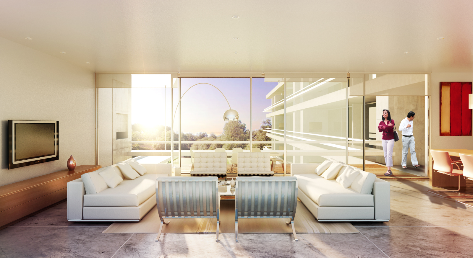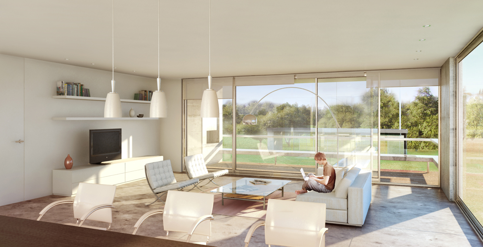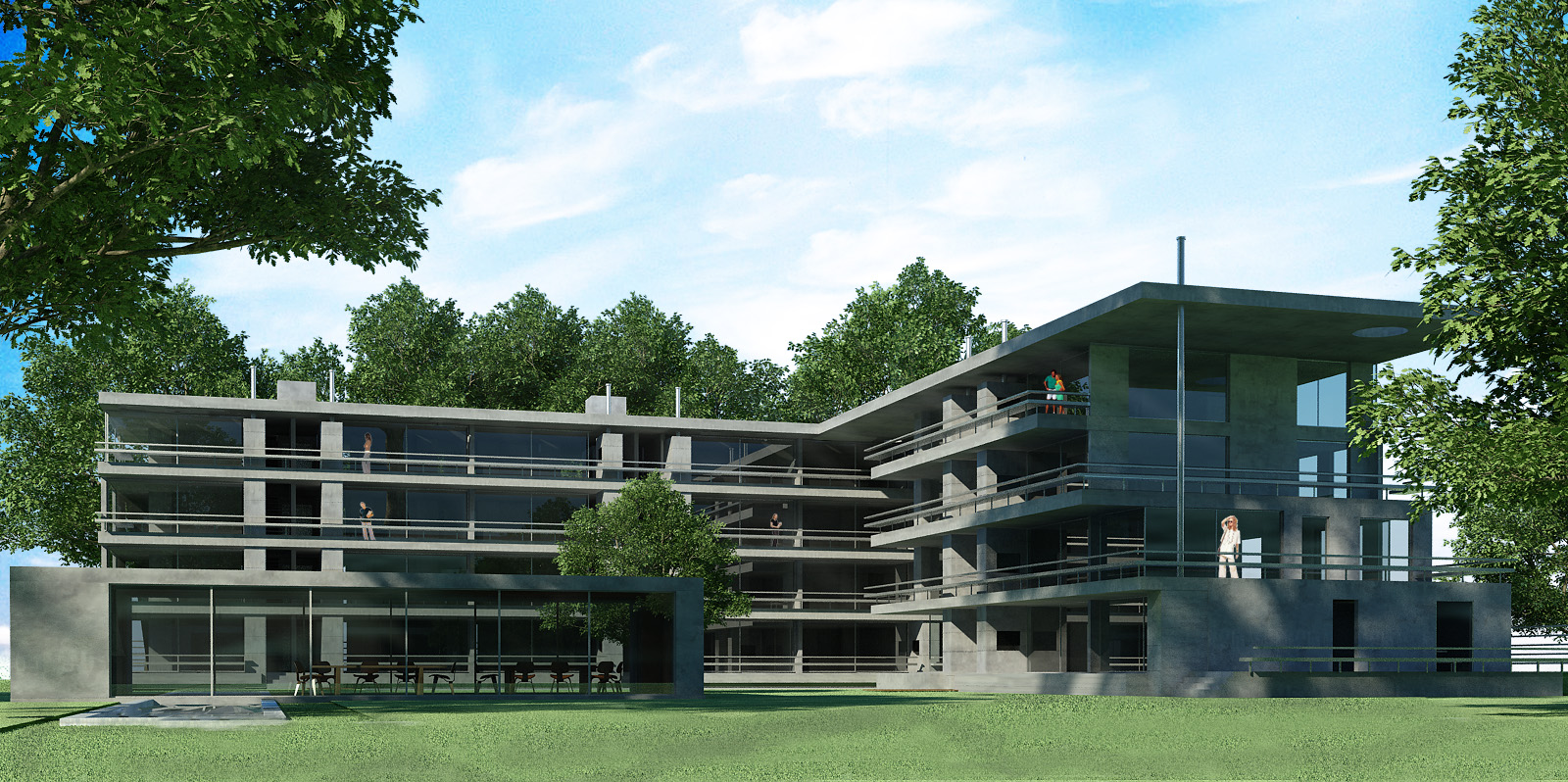 Es por ello que se decidió adoptar un modelo de vivienda flexible, donde el núcleo sanitario divide en dos sectores a la unidad, permitiendo de esta forma que las áreas de descanso siempre se vuelquen al exterior del conjunto y las sociales (estar-comedor-cocina) balconeen al jardín. Generosas terrazas con parrillas por las que se accede a las viviendas, son el nexo entre las mismas y el jardín, y es allí donde se propone el vínculo visual con el área deportiva del club.