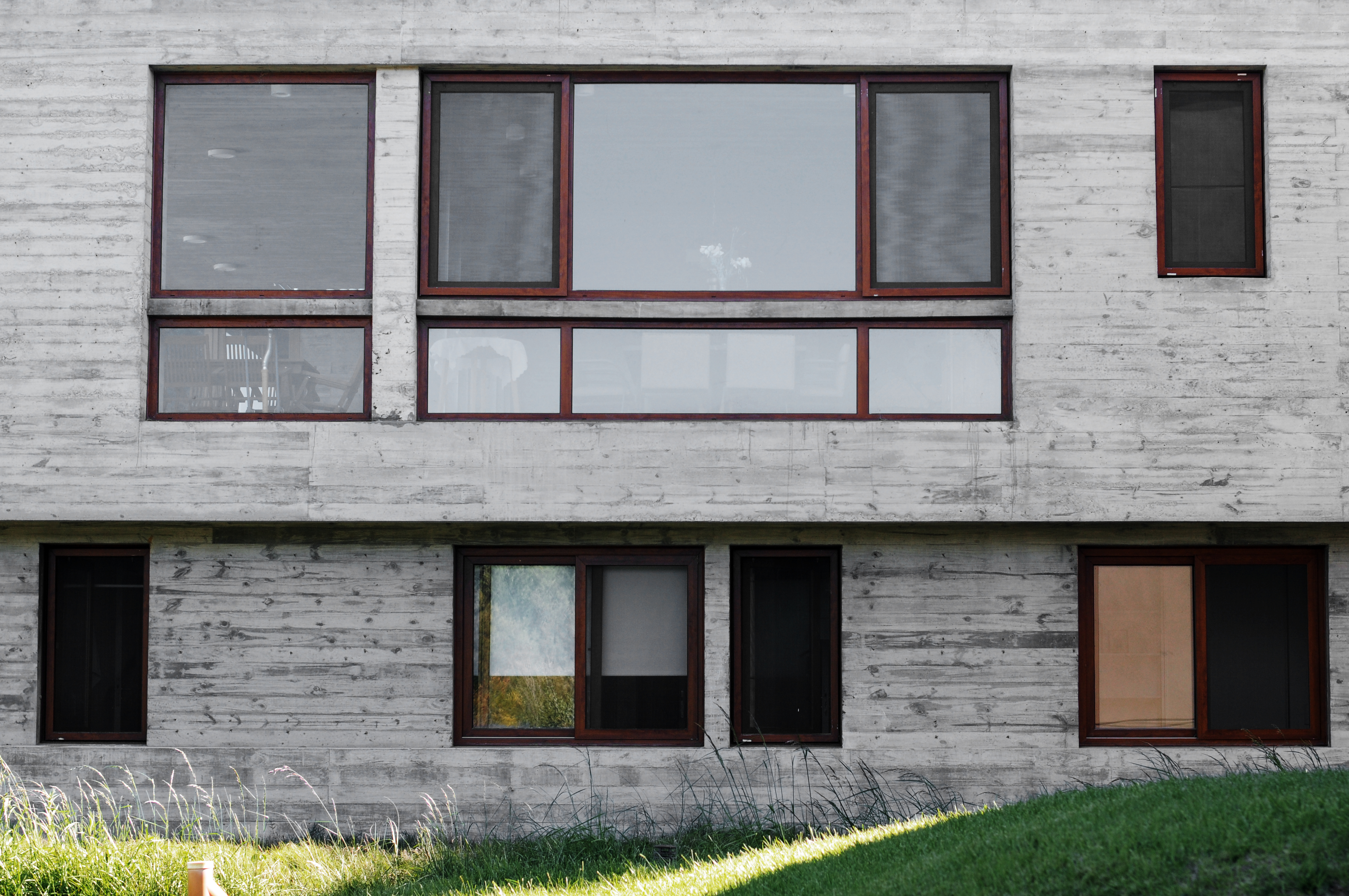 Los vuelos laterales de los tabiques ubicados en el nivel superior, le confieren una dinámica protectora a las inclemencias del tiempo, como así también afirman el carácter brutalista de la casa.