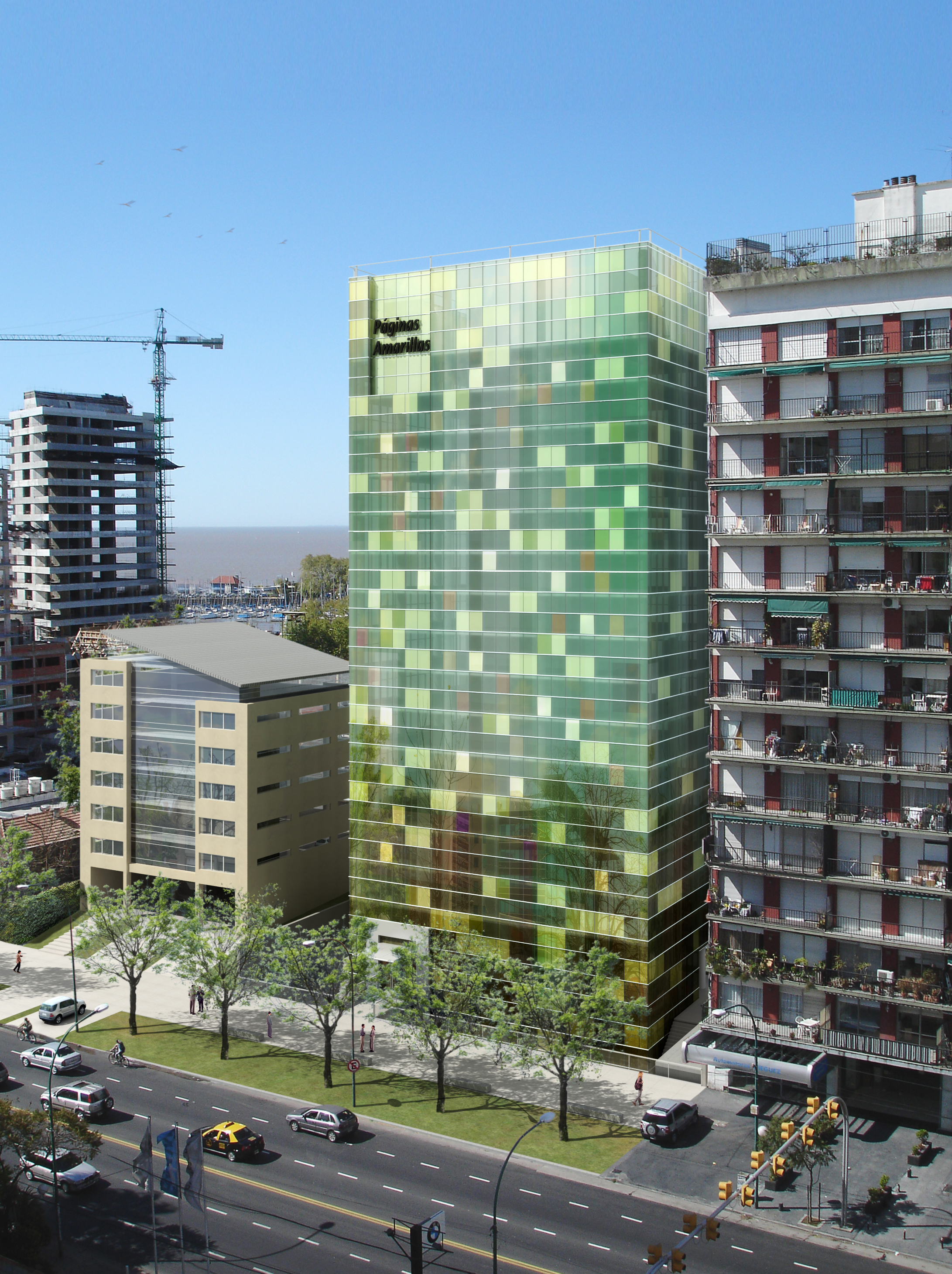 El tratamiento de la fachada con piel de vidrio tornasolado remite tanto a la imagen institucional buscada, como a los ritmos de partimiento del edificio vecino. El remate del fuste que incorpora el logo de la empresa en la fachada termina definiendo al edificio como fiel exponente de una arquitectura adecuada a su entorno y a las exigencias simbológicas requeridas por el comitente.