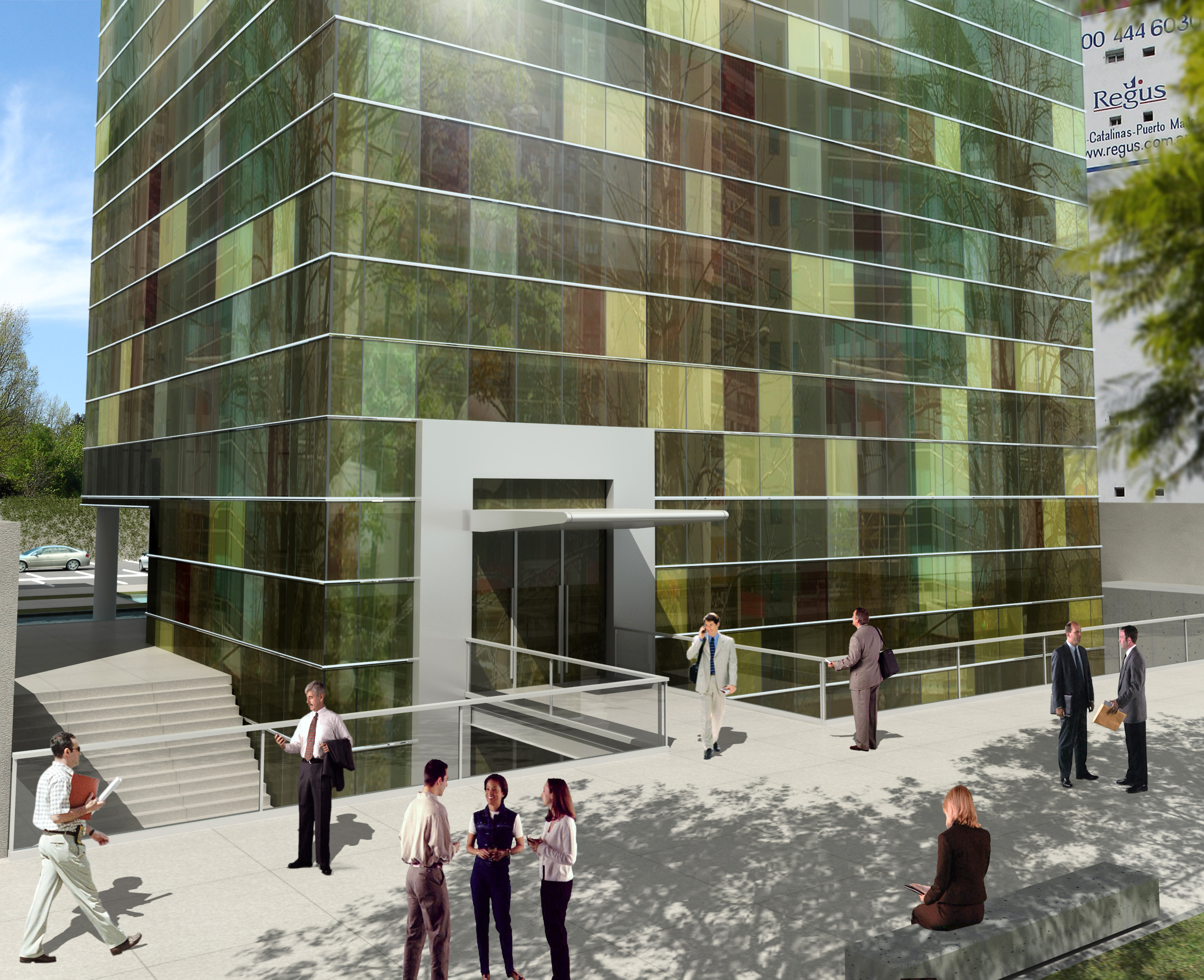 El edificio se ofrece a la ciudad con una silueta de características puras que emerge del subsuelo y se vincula con la vereda a través de un puente metálico que oficia de acceso.El “patio inglés” resultante es tratado como espejo de agua y se convierte en la expansión natural de la sala de convenciones que se ubicó en el primer subsuelo. El resto del primer subsuelo y la totalidad del segundo albergan el estacionamiento cubierto.